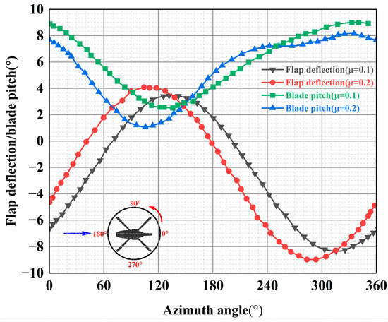 Figure 13 presents the variations in the flap deflections and ECR blade pitches versus the azimuth angles under different advance ratios. It can be observed that the flap deflections and blade pitches under various advance ratios demonstrate similar characteristics, with a small absolute value at the advancing side and a large absolute value at the retreating side. At the advancing side, the flap initially deflects upward to generate the nose-up moment to increase the blade pitch for trim; as the blade pitch in the trim state decreases, the flap deflection decreases accordingly. When the desired blade pitch trim variable is less than the blade pre-index angle of 6°, corresponding to the positive flap deflection, meaning that the flap deflects downward, generating the nose-down moment to decrease the blade pitch to achieve trim condition. Similarly, the situation of the retreating side can be analyzed. Furthermore, as the forward flight speed increases, the asymmetry of the velocity distributions between the advancing side and the retreating side increases, causing a larger flap downward deflection at the advancing side, generating increased nose-down moment to reduce the blade pitch and a larger upward deflection at the retreating side generating increased nose-up moment to increase the blade pitch.