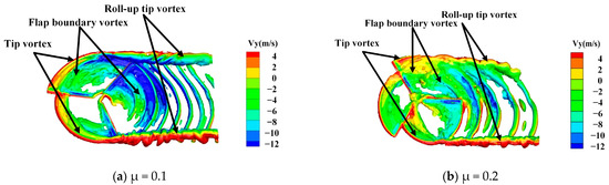 The distributions of the ECR wake in the flow field vary under different advance ratios due to the different blade pitches and flap deflections at different azimuth angles. Figure 14 presents the ECR vorticity isosurface diagrams of the wake flow field colored with velocity in the y-direction under various advance ratios. It can be observed that, at the advance ratio of 0.1, the relatively small flap deflection at an azimuth of 90° results in no intense wake vorticity shed from the flap. In contrast, at the azimuth of 0°, the intense flap tip vortices can be observed due to the relatively large flap deflection caused by the superposition of the flap lateral cyclic deflection and flap collective deflection. Moreover, the intense roll-up vortex primarily formed by the blade tip vortex can be observed on both the advancing and retreating sides. As the advance ratio increases to 0.2, at the azimuth of 90°, there are no apparent blade tip vortices due to the relatively small blade pitch, while the intense flap tip vortices shed from both ends of the flap can be observed. Similar to the situation with an advance ratio of 0.1, the visible roll-up vortices are also formed on both the advancing and retreating sides. On the advancing side, the roll-up vortex is primarily formed by the flap wake vortex, whereas on the retreating side, although the flap tip vortices are conspicuous, the roll-up vortex is mainly formed by the wake vortex shed from the blade. The intensity of the roll-up vortex on the retreating side is diminished compared to that when the advance ratio is 0.1.