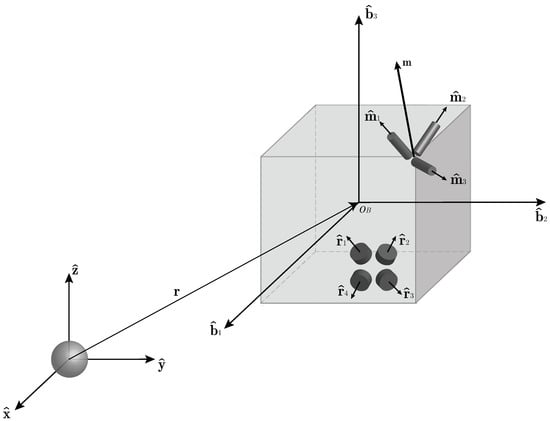 This study considers a spacecraft orbiting in LEO with various attitude modes. Inertial pointing, nadir pointing, target tracking, and velocity dumping modes are considered in this research study. The spacecraft attitude dynamics are described with Euler’s equation for rigid body motion, which is expressed in the body reference frame, B, with origin in . The spacecraft’s body axes are denoted as , , and . The attitude of the spacecraft is referenced to an Earth-centered inertial (ECI) frame, I, through the attitude matrix, , which is parametrized in terms of the quaternion, . The spacecraft orbital position is represented in I by the radius vector , which is associated to the inertial axes , and . The complete problem setting is reported in Figure 1.