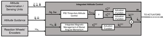 The control torques are finally converted in the actuation commands to be sent to the actuators. Thus, the desired torque is applied to each individual reaction wheel, and the magnetic dipole moment is generated by each magnetic torquer. The architecture of the proposed attitude control system is reported in Figure 2.