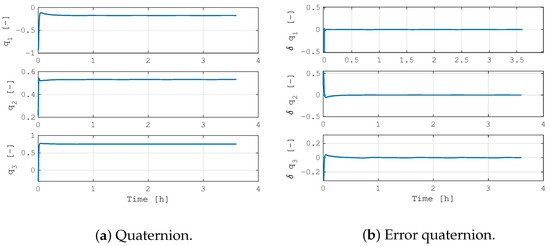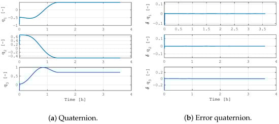 Similar results were also obtained in the tracking mode of a time-varying reference attitude. In this case, a generic slew maneuver is commanded to follow a predefined attitude profile. The system follows the time-varying reference for the initial 1.5 h; then, it maintains the final steady-state condition. Figure 6 reports the time evolution of the attitude in terms of quaternions, together with the error with respect to the reference target state. Additionally, in this case, the attitude performance is demonstrated by a quick convergence to the desired state, followed by a good maintenance of the time-varying attitude profile. The integrated magnetic management of the stored angular momentum is capable of dissipating the reaction wheels’ spin rates, as shown in Figure 7, without affecting the attitude control performance. Note that the oscillation in the reaction wheels’ speed, similar to the previous case, is due to the periodic trend in the external environmental perturbations. The magnetic torquers’ load is again about 30% of the maximum actuator capacity, as evident from Figure 8.
