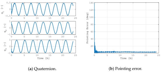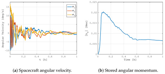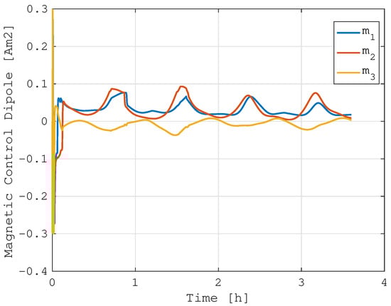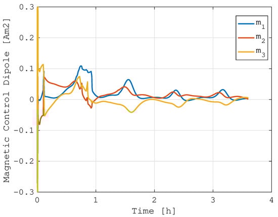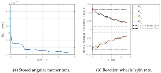 Figure 3 shows the results in the case of a system aligned with a reference inertial direction, where the plots report the quaternion and the error quaternion evolution over time. Note that only the quaternion vector part is shown, being the scalar part immediately available from the unit norm constraint. In this simulation, the system quickly converges to the reference state, and it reaches the complete steady-state condition in less than 15 min. However, the most important result is reported in Figure 4, where the stored angular momentum is plotted with respect to time. For a more immediate visualization, the figure also reports the reaction wheels’ angular velocity. The angular momentum initially increases because of the required attitude maneuver to point in the reference direction, but it is quickly dumped out by the integrated magnetic momentum management control. In about 3 h, the reaction wheels are slowed to almost 10% of their maximum momentum capacity. Note that the simulation was initialized with the 4 reaction wheels at around 75% of the maximum storable angular momentum. This is achieved due to the integrated magnetic control law, which is commanded at the same time as the reaction wheels. The required magnetic dipole is reported in Figure 5, showing that a continuous magnetic torque is actuated. In the presented analysis, the maximum available magnetic dipole is 0.3 Am2, and the maximum momentum capacity of each reaction wheel is 2 × 10−2 Nms. It can be highlighted how the continuous angular momentum management loads the magnetic torquers in the order of 30% of their maximum capabilities. Moreover, it is worth noticing how the pointing performance is not affected by the integrated control law.