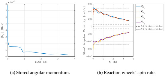 Figure 9 shows the dynamics’ evolution of the spacecraft in the considered mission scenario along a 24 h simulation. The periodic trend in the quaternion components is due to the nadir-pointing mode, and the pointing error value confirms the positive achievement of the proposed control system. Indeed, the residual error is mainly due to the attitude determination errors, while the small oscillation is associated with the reaction wheels’ jitter. The management of the angular momentum is effective even in the real case, with the average storage level in the low range of the plot, as shown in Figure 10. The initial build-up of the momentum is positively dumped out in less than 30 min, and the average reaction wheels’ spin rate is about 10% of the saturation value. This is due to the fact that below this threshold, the integrated magnetic control is not active in maintaining the actuators far from the zero-velocity level, with a beneficial effect on the reaction wheels disturbances. Indeed, a minimum spin rate of the rotors minimizes the friction in the bearings and the vibrations due to the zero-crossing dead band. To further prove the positive impact of the proposed integrated control system, the same simulation was repeated with the continuous reaction wheels’ desaturation switched off.