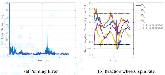 Figure 11 reports the pointing error and the reaction wheels’ spin rate for the same simulation scenario described above, but with pure three-axis PID attitude control. The simulation was run for 3.5 h, and it was initialized with the same initial conditions as the previous case. It is evident how the control performance is worse. Indeed, the higher average rotation rates of the rotors induce larger oscillations in the pointing error because of the higher jitter due to the static and dynamic imbalance of the actuators. Moreover, at t∼2.5 h, the pointing error rises because of the saturation of two reaction wheels, namely, and . In this case, the real spacecraft system would have entered an emergency desaturation mode to avoid this problem. Furthermore, the system level performance would be affected by this trend because higher spin rates of the reaction wheels are typically associated with larger power consumption, which has a negative impact on the spacecraft’s power budget.