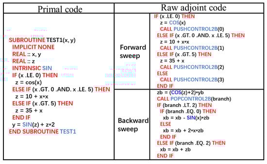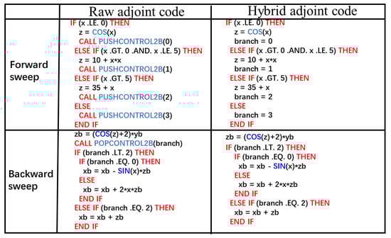 The PUSHCONTROL/POPCONTROL mainly exists in the conditional statements, as shown in Figure 1. In the primal code, x is the independent variable, z is an intermediate variable, and y is the dependent variable. It can be seen in the primal code that the statement is used to evaluate z and different will affect the dependent variable y. In the raw adjoint code, integers (0, 1, 2, and 3 in this case) are used to represent the branches of the statement. The PUSHCONTROL2B function is called to record the branches in a forward sweep. In a backward sweep, the recorded branch statuses are retrieved by calling the POPCONTROL2B function. It can be seen from this example that PUSHCONTROL2B/POPCONTROL2B functions are used to record and retrieve conditional branches in the raw adjoint code.