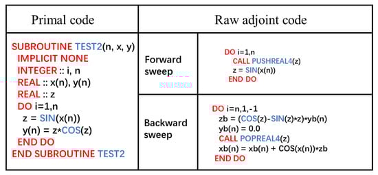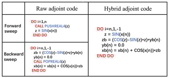 Figure 2 shows the raw adjoint code for recording and retrieving single-precision floating-point numbers. The primal code only has one do loop. In the do loop, the intermediate variable z is computed first and then used to compute the dependent variable y. In the raw adjoint code, two do loops are produced. The first is to calculate z and push it into a stack just before overwriting. Later, these values are retrieved by a pop operation in the second do loop and used to compute sensitivity. It can be seen in the raw adjoint code that the number of PUSH/POP function calls increases proportionally with the loop count n. For a large n, the extra PUSH/POP function calls will greatly increase the computational cost.