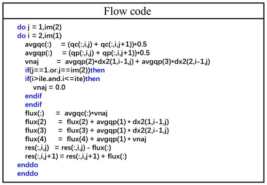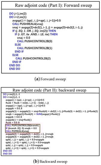 Figure 5 shows part of the codes of a two-dimensional flow solver. The code snippets correspond to the convective flux calculation. In Figure 5, is the conservative variable vector; is the primitive variable vector; is the spatial residual vector of the flow governing equation; and are the number of grid points in the two grid directions, respectively; is the geometry metrics vector of the mesh; and the remaining are intermediate variables. The adjoint codes produced by the AD tool are presented in Figure 6. It contains two parts: the forward sweep part (Figure 6a) and the backward sweep part (Figure 6b). The forward part mainly calculates and stores intermediate variables. The values of the intermediate variables are retrieved in the backward part. Because the flow codes contain different types of intermediate variables, both PUSHCONTROL2B/POPCONTROL2B and PUSHREAL4/POPREAL4 function pairs are called in the raw adjoint codes. The former is for conditional branches, and the latter is for the intermediate variable . It can be found in the two figures that the number of PUSH/POP function calls required depends on the number of grid points. For cases with millions or even billions of grid points, the function calls will greatly affect the computational efficiency of the adjoint codes.