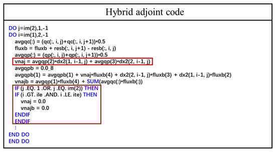 The strategies used to develop the hybrid adjoint codes are: first, delete the forward part of the adjoint codes (Figure 6a); second, replace the adjoint codes in the red rectangle of Figure 6b with manual codes in the two red rectangles of Figure 7. The manual codes in the first rectangle are used to calculate and those in the second one are related to the conditional branches. Since the calculation of involves , the manual codes in the first rectangle should be put before . Compared with the raw adjoint codes, the hybrid adjoint codes are easier to read. In terms of computational cost, the hybrid adjoint codes are more efficient. This is because there are no PUSH/POP function calls in the hybrid adjoint codes anymore.