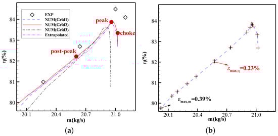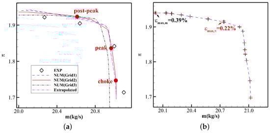 In terms of total pressure ratio and mass flow rate (see Figure 11a,b), the maximum discretization uncertainties of total pressure ratio and mass flow rate are 0.22% () and 0.39% (), which corresponds to and kg/s, respectively. Based on the above results, it is concluded that the discretization uncertainties are very small and a grid-converged solution is obtained. To make a trade-off between solution accuracy and computational cost, Grid2 will be selected in our study.