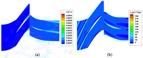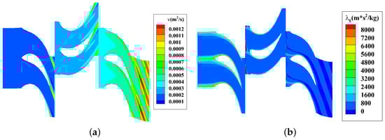 Flow and adjoint fields at 50% span of the Aachen turbine. (a) Turbulence quantity. (b) Adjoint quantity corresponding to the turbulence model equation.