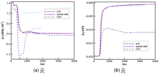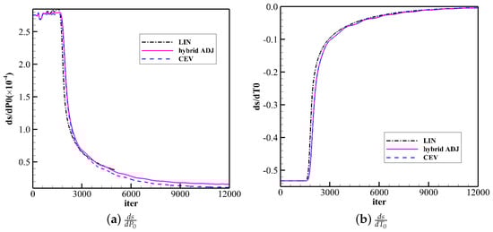 Figure 24a,b present the sensitivity convergence histories of the entropy generation rate to the inlet total pressure and the inlet total temperature, respectively. It can be seen in the two figures that the hybrid ADJ almost has the same sensitivity convergence histories as the LIN, while there is a visible difference between the CEV and the hybrid ADJ, especially for the design variable of the inlet total pressure. Compared with NASA Stage 35, the effect of the CEV assumption on sensitivity is smaller, and the maximum difference for the design variable of the inlet total pressure is less than 20%.
