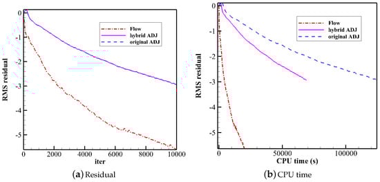 Figure 26a shows the RMS residual convergence histories of the flow and adjoint solvers. It can be seen in this figure that after 12,000 iterations, the flow solution is converged. Moreover, the adjoint RMS residual reduces by over two orders, which is enough to obtain converged adjoint sensitivities (see Figure 24).