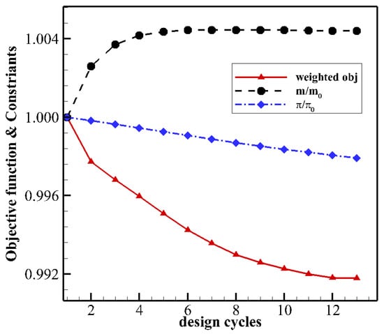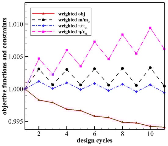Figure 27 shows the evolution histories of the weighted objective function and constraints. It can be seen in this figure that, after thirteen design cycles, the weighted objective function goes flat and is decreased by 0.8%. The variations in mass flow rate and total pressure ratio are also within an acceptable range.