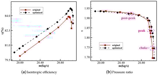 The rotor blade camber decreases from the leading edge to the middle chord and increases slightly over the remaining chord. This reduces the blade loading, leading to reduced flow separation region on the suction surface after the shock (see Figure 19). The radial distributions of the rotor aerodynamic parameters, as shown in Figure 20, further demonstrate this point. In Figure 20, the performance metrics are calculated along a streamwise grid line. The metrics do not necessarily represent the actual performance of the local flow field, as the flow often does not follow a grid line. Nevertheless, the metrics can still reveal the performance variations between the original and the optimized designs, as the mesh at the inlet and the outlet of a domain will not change after optimization. It can be seen in Figure 20 that the total temperature and pressure ratios, except for the blade tip region, decrease after optimization. An increase in the isentropic efficiency, especially from the 40% span to the 70% span, can be observed.