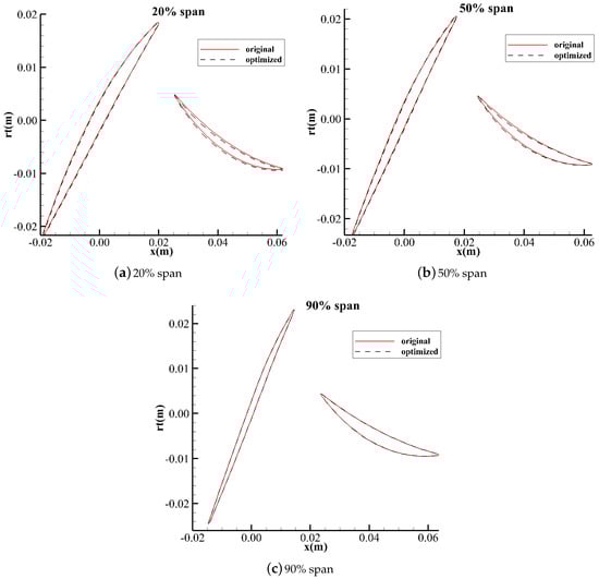 Comparison of original and optimized blade profiles at three different spans for the Aachen turbine.
