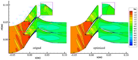The stator blade camber is increased over the whole chord. This reduces the local incidence, leading to reduced profile loss. The reduced incidence also reduces the supersonic patch and associated aerodynamic loss on the blade suction side as shown in the close-up of Figure 19. Figure 21 compares the radial distributions of the stator aerodynamic parameters-total pressure ratio, inlet, and outlet flow angle ( and ), calculated across the stator only. The total pressure ratio is greatly increased from the hub to the 60% span and slightly decreased from the 60% span to the 80% span. Overall, the total pressure ratio increases for the optimized blade profiles. The inlet flow angle (absolute value) reduces from the 30% span to the 80% span. The reduced flow angle together with the increased blade inlet angle further reduces the incidence and profile loss. The outlet flow angle increases from the 10% span to the 70%, however, a slight increase can be observed from the 70% span to the 90% span. Around the hub and shroud, there is no visible difference between the original and optimized blade profiles.