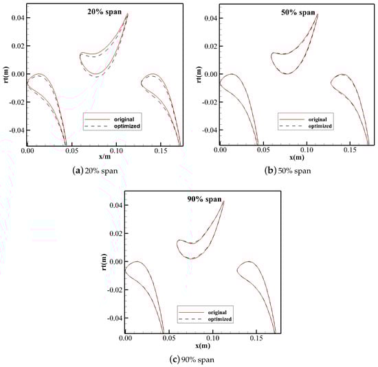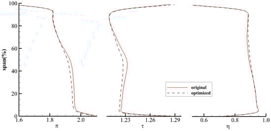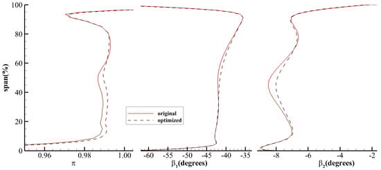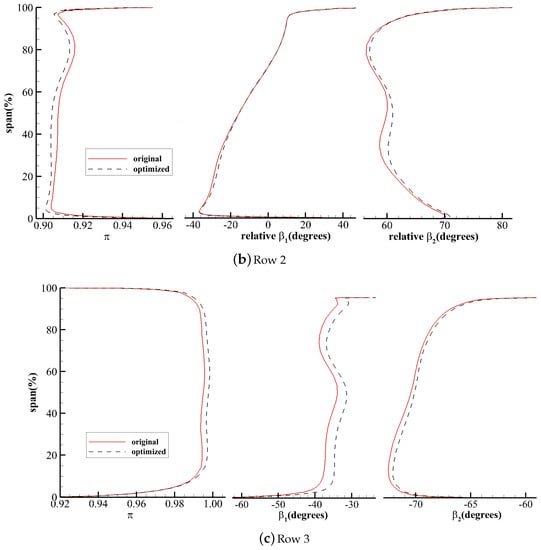 Figure 29a–c compare the radial distributions of aerodynamic parameters of each row. The total pressure ratio and the outlet flow angle are presented in the first row. It can be seen that there is no visible difference in radial distributions of the total pressure ratio along the whole span. The outlet flow angle decreases from the hub to the mid-span and slightly increases from the mid-span to the 80% span while the change in the blade tip region is negligible. The reduced outlet flow angle below the middle span can be explained by the reduced blade camber resulting in a reduced turning angle. In the second row, the optimized total pressure ratio decreases, and the relative turning angle increases (the relative outlet flow angle increases while the relative inlet flow angle is almost maintained) compared with the original one. This is because the rotor blade with an increased camber extracts more energy from its surrounding flows, leading to more pressure drop and a bigger relative turning angle. In the third row, optimization increases the total pressure ratio along the whole span. The increase in total pressure ratio can be attributed to the reduced blade loading resulting from the increased blade inlet angle and the reduced inlet flow angle.