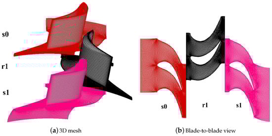 Figure 22a presents the three-dimensional mesh and Figure 22b presents the blade-to-blade view of the mesh at 50% span. The mesh has a density of in the first row, in the second row, and in the third row, leading to 1.53 million grid nodes in total.