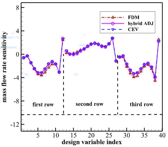 Figure 25 compares the sensitivity accuracy among different methods with the coefficients of the Hicks-Henne hump function being used as design variables. Twelve design variables for both s0 and s1 and fifteen design variables for r1 are randomly selected from different spans and chords in this verification. There is good agreement in sensitivities between the hybrid ADJ and the FDM. The maximum relative difference comes from s1 but is still small enough (less than 1.0%). Different from NASA Stage 35, the effect of the CEV assumption on the sensitivity accuracy of the Aachen turbine is not obvious. The CEV sensitivities also have good agreement with the FDM sensitivities.
