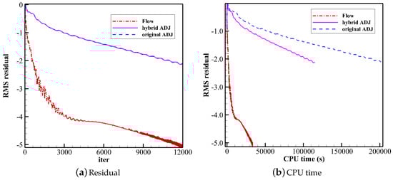To verify the high computational efficiency of the hybrid ADJ over the original ADJ, the RMS residual against the CPU time is compared, as shown in Figure 26b. The iterations are set to 12000 for all solvers. Still, both the original and hybrid adjoint solvers consume more time than the flow solver. Compared with the original ADJ, the hybrid ADJ can save 44% CPU time (see Table 4). Moreover, it is found that the hybrid ADJ can save 9.6% of memory (see Table 4).