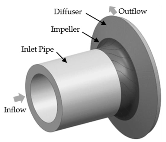 Based on the structure of the MIX-130 fan, its fluid domain can be extracted, as depicted in Figure 2. The fluid domain includes three parts: the inlet pipe, impeller, and diffuser.