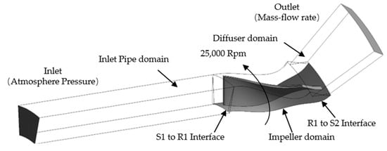 The impeller is set as a rotating area with a speed of 25,000 Rpm, and the inlet tube and diffuser part are set as a stationary area. “Mixing-plane” technology is adopted to connect the interface between the rotary static interface, which axially averages the parameters of the interface of the upper-level components and then transmits them to the interface of the lower-level components [36]. All walls are in a slip-free condition. The calculation is considered convergent in steady-state computation when the root mean square residual is less than 10−5.