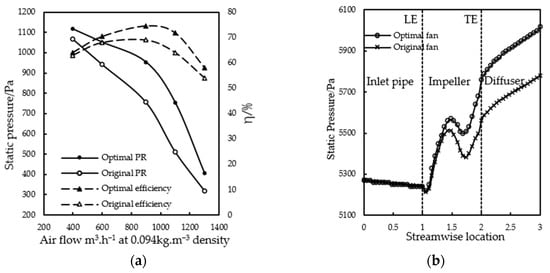 As depicted in Figure 5a, the static pressure rise and efficiency of the original and optimized fans change with the flow rate. The static pressure rise and efficiency of the optimized fan are higher than that of the original fan.