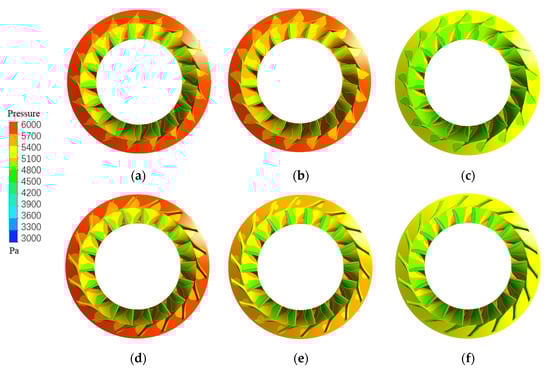 Static pressure distributions in impellers of original and optimized fans: (a) optimize impeller 0.8 Q; (b) optimize impeller Q; (c) optimize impeller 1.2 Q; (d) original impeller 0.8 Q; (e) original impeller Q; (f) original impeller 1.2 Q.