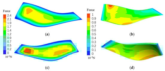 Blade force distribution (a) optimize blade pressure surface; (b) original blade pressure surface; (c) optimize blade suction surface; (d) original blade suction surface.