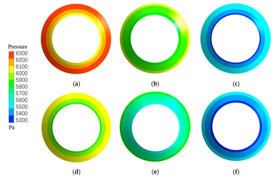 Static pressure distributions in the diffuser of original and optimized fans: (a) optimize diffuser 0.8 Q; (b) optimize diffuser Q; (c) optimize diffuser 1.2 Q; (d) original diffuser 0.8 Q; (e) original diffuser Q; (f) original diffuser 1.2 Q.