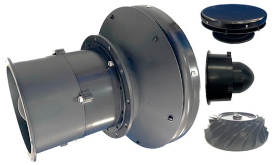 The mixed-flow impeller can consider the characteristics of the high-pressure head of a centrifugal fan and the large flow of an axial flow fan [32]. The vaneless diffuser has a wide flow range and simple structure [33], so the fan structure design with the mixed impeller and vaneless diffuser is more appropriate for the variable working conditions of the stratospheric airship fan. Figure 1 illustrates the MIX-130 fan, the object of this study.