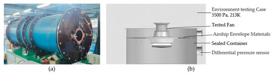 The maximum static pressure of the MIX-130 and MAX45016 fans under stratospheric conditions was tested when the environment was stable at a temperature of 213 K and a pressure of 5500 Pa using the test bench in Figure 10b. As depicted in Figure 12, the test was completed in the Environmental Laboratory of Aerospace Information Research Institute, Chinese Academy of Sciences. The maximum static pressure of the MAX45016 and MIX-130 fans are 503 and 1210 Pa.