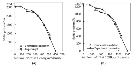 The curve of static pressure variation with the flow of the MIX-130 fan at normal temperature and pressure (P-Q curve for short) can be obtained using the numerical analysis model and method in Section 2 and changing the boundary conditions into the ground test environment. As depicted in Figure 11a, the two P-Q curves represent the numerical simulation and test results. The MIX-130 fan has a maximum static pressure of 2550 Pa and a maximum flow rate of 600 m3/h at 40% of the maximum speed on the ground, and there is no saddle-shaped area in the entire P-Q curve. Based on the analysis, the average error between the numerical simulation and the experimental test is 3%, confirming the accuracy of the numerical analysis.