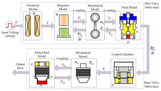 Before establishing the mathematical model of the AMOHSV, it is necessary to understand the motion mechanism and energy conversion of the AMOHSV, as shown in Figure 2. Under the driving voltage, the electro-mechanical converter (solenoid) converts electrical energy into mechanical energy and pushes the pilot valve to move. Then, the pilot valve outputs the flow rate to regulate the pressure of the control chamber for controlling the opening and closing of the main valve.