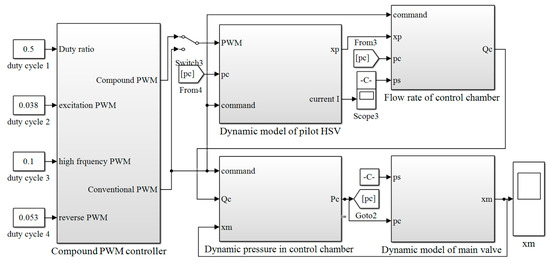 Based on Equations (1)–(17), a simulation model of the AMOHSV is established using MATLAB/Simulink as shown in Figure 3, in which a Runge–Kutta algorithm is selected as the type of solver and the fixed-step size is set as 0.05 ms. The main parameters are listed in Table 1. In Table 1, the resistance of the coil (R) is measured using a digital multimeter; the supply pressure (ps) is measured using a pressure sensor; and the number of coil turns (N), the damping coefficient (Bp), and the effective sectional area of armature (Se) are identified using experimental data [29], which are different from the data used to determine the valve response. Other parameters can be found in the design and manufacture stages.