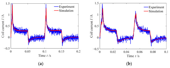 Comparisons of the coil current under different frequencies: (a) 10 Hz; (b) 20 Hz.