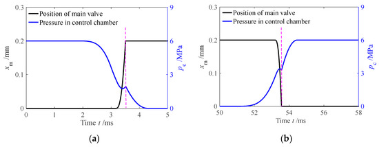 In some practical applications, the position of the valve cannot be measured because the valve is usually mounted in a hydraulic valve block. To indirectly obtain the opening and closing time of the AMOHSV, the relationship between the pressure in the control chamber and the main valve’s position is analyzed using simulations during the opening and closing stages respectively, as shown in Figure 6.