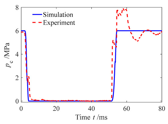 Figure 6 shows that, in the opening stage, when the main valve reaches the maximum position, an upward inflection point occurs on the pressure curve which can be explained using Equation (13). The total opening time of the main valve is 3.52 ms. In the closing stage, when the main valve reaches the minimum position, a downward inflection point occurs on the pressure curve which can be explained using Equation (14). The total closing time of the main valve is 3.57 ms.