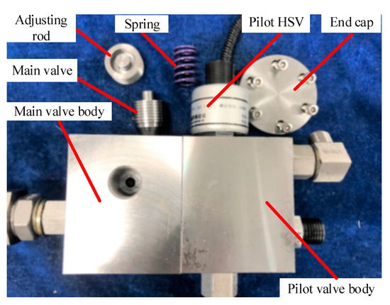 To study the dynamic characteristics of the proposed two-stage high-speed on/off valve with adjustable maximum opening (AMOHSV), comprehensive performance tests are conducted on a hydraulic test platform. A prototype of the proposed AMOHSV is designed, fabricated, and assembled, as shown in Figure 8.