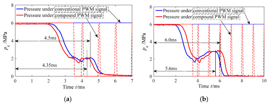 Comparisons of the pressure in the control chamber during the de-energized stage at the frequency of 10 Hz: (a) The adjustable maximum opening is 0.2 mm; (b) The adjustable maximum opening is 0.4 mm.