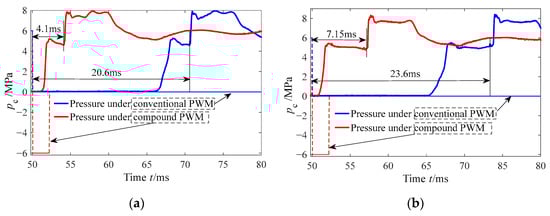 Indeed, the initial voltage (24 V) of the compound PWM is the same as that of the conventional PWM, which means that the total opening time should theoretically remain the same. However, in Figure 9a,b, the total opening time shows irregular variations, which may be caused by several factors, such as pressure fluctuation, adjustment error of the main valve’s maximum displacement, and resistance variation due to the temperature rise.