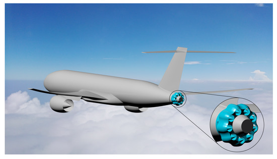 In this study, the configuration-of-interest, depicted in Figure 1, features a conventional tube-and-wing fuselage with multiple aft-fuselage boundary layer ingesting (BLI) propulsors that are driven electrically. The under-the-wing gas turbine engines, besides generating thrust, drive generators to provide the required power for the BLI propulsors. Although this configuration is not able to ingest as much of the boundary layer as the propulsive fuselage concept, it is expected to fare better in non-aerodynamic areas such as weight, power system integration and noise [7]. Compared with the CENTRELINE propulsive fuselage concept [5], which uses an 8 motor for the BLI propulsor, a distributed BLI configuration significantly reduces the motor power rating P in each propulsor. This brings the power requirement in line with the projection of 1–3 for the non-cryogenic motor technology at Technology Readiness Level (TRL) 6 in 20 years’ time [8]. As the weight of conventional engines and motors scales with [9] and [10], having multiple smaller propulsors will have a significant weight advantage over a large BLI fan. This also reduces the weights of the BLI fan containment system and additional airframe structures needed to support a rear propulsion system. Furthermore, the distributed propulsion system also allows independent control over the propulsors and thrust vectoring [11], which reduces the weight of the airframe control surfaces. This paper represents a first investigation into the aerodynamics of this novel configuration and first attempt to assess its aerodynamic performance.