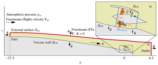 Distinguishing among the different types of surfaces is important when drawing up a mechanical power balance for CV , as a divergence theorem will transform some of the volume integrals into fluxes across these surfaces, which is outlined in the next section and Appendix B. Some of the integrals can be simplified by considering the relationship between the outward surface normal vector and the freestream and local velocity vectors , . In general, the surfaces can be divided into four categories: propulsor inlets and outlets , shown in blue in Figure 3; moving surfaces , coloured in orange, with local wall velocity vector (therefore ); stationary viscous walls where (hence ); and external surfaces , which are shown in red in Figure 3. The external surfaces can be further classified into inlets, outlets and non-stream-surface freestream boundary (); stream-surface (, but ); and side slip walls for modelling symmetry (, , and due to slip wall alignment ). Note that even in the case , the work done from viscous stress may not be zero, as the surface shear stress may not be perpendicular to . The same argument applies for even when .