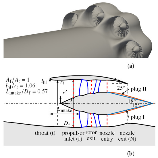 Details of the installation. (a) 3D view. (b) Propulsor meridional view showing the two different nozzle plugs for cases I and II.
