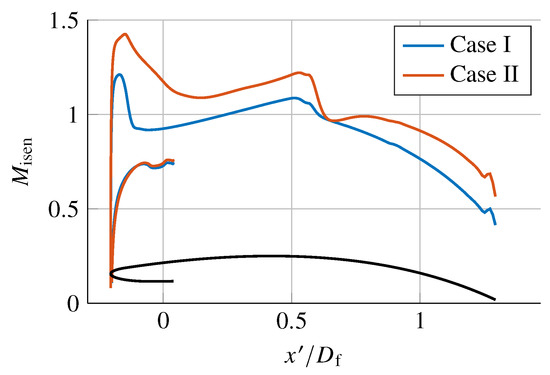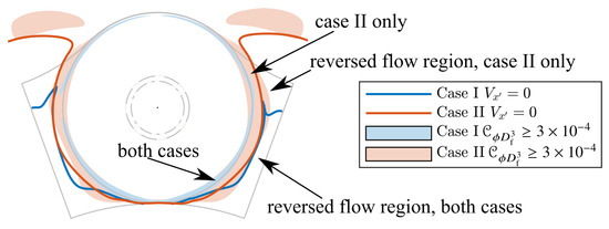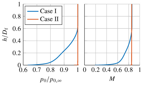 At the cowl trailing edge, flow separation is observed in both cases due to the sharp corner. The extent of the reversed flow region, measured by the axial velocity aligned with the propulsor , is indicated in Figure 11. As the flow remains attached up to the trailing edge in case I, the separation region is much smaller compared to case II. As the static pressure around the nozzle is governed by the point of separation, it is much lower in case II, since the flow separates at mid-cowl.