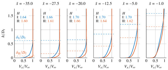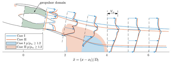The development of the fuselage BL along the fuselage contraction is displayed in the velocity profiles in Figure 7, with the extent of the boundary layer indicated by the dashed lines. Along the contraction, the boundary layer thickens in both cases due to the diffusion in the adverse pressure gradient. The influence of the pressure field is also discernible in the BL edge velocity deviations from in Figure 7. Near the propulsor inlet at , the boundary layer is about 50% taller than the propulsor in case I, but comparable in size in case II, as indicated by the dashed lines.