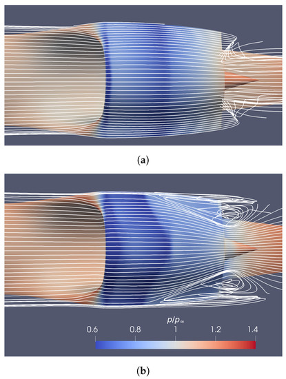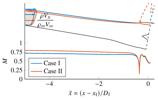 In case II, as the boundary layer is thinner, its mass flux is higher, as depicted in Figure 9. Although the mass flow rate through the propulsor is 8% higher in case II, its captured streamtube has a smaller area. Consequently, the stagnation streamlines, which separate the internal and external flow, hit the inlet lip at a higher incidence, as shown in Figure 9. Due to the thinner BL, the flow approaching speed is also higher. These two factors lead to a higher acceleration around the cowl lip, which is reflected in Figure 8. This causes a large supersonic region in the front half of the cowl. The supersonic region terminates with a stronger shock wave at M 1.17–1.22, causing the flow to separate at the side slip walls, as clearly shown by the streamlines in Figure 10b, which are lifted off the cowl. The separation creates a large blockage, which pushes the cowl flow towards the centre, converging just above the exhaust jet at the trailing edge.