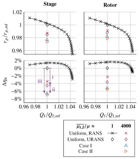 Compared with the operation in the uniform inlet flow with (⋄) shown in Figure 13, obtained from a 1/6th annulus URANS calculation with the same propulsor mesh, the fan stage suffers from a 6.6% drop in total–total efficiency and a 2.3% reduction in total–total pressure ratio in case I (Δ).