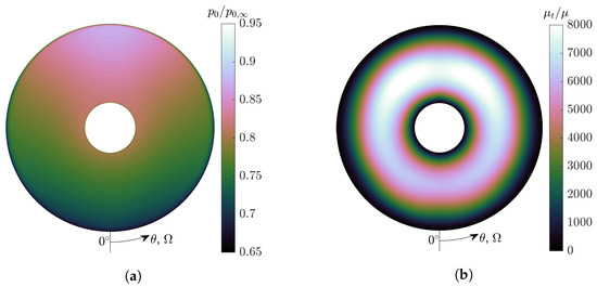 Propulsor inlet distortion, case I. (a) Total pressure distribution . (b) Turbulent viscosity ratio .