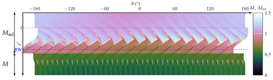 The entropy function at the rotor exit in Figure 15 is a measure of the entropy increase relative to freestream conditions and . As the inlet distortion is symmetric around , it can be concluded that the loss within the rotor is higher in the counter-swirl region ().